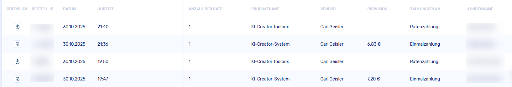 Am ersten Tag kamen nicht nur einzelne Verkäufe, sondern auch diese Ratenzahlung über 12 Monate. Schaut euch das an: Rate 2 ist schon da, und die nächsten 11 folgen automatisch. Insgesamt 554 Euro purer Provision. Und das war nur der Start..