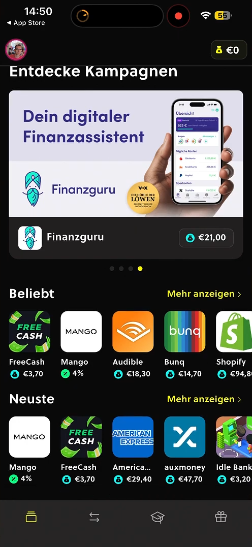 Ich habe mit dem Finanzguru Deal gestartet. Nur für eine kostenlose Registrierung gibt's 12,60€. Schließt der User das Abo für 2,99€ ab, kommen noch über 8€ dazu. Das ist fast zu gut, um wahr zu sein.
