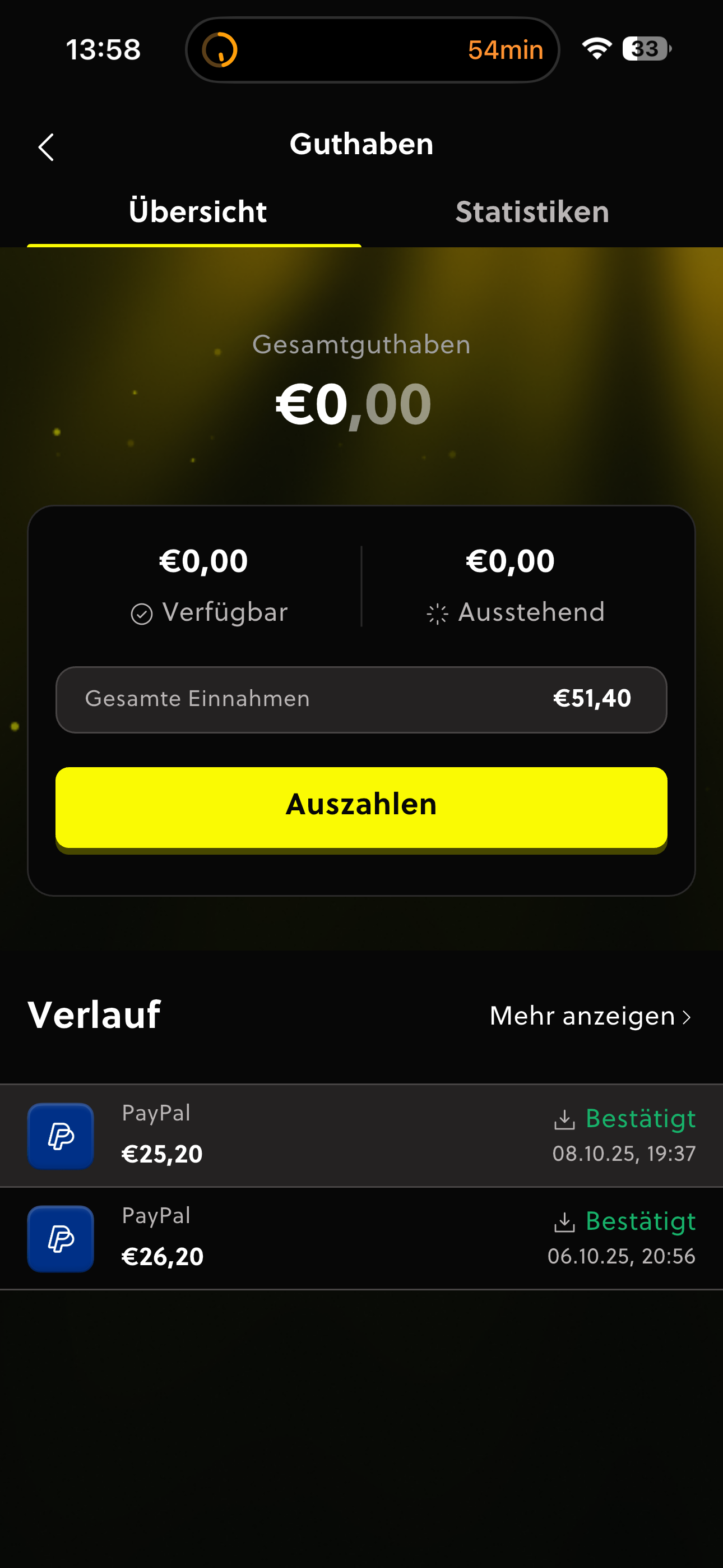 Oben rechts beim Geldsack seht ihr den Kontostand. Tippt drauf und ihr seht Guthaben. Auszahlung ab 25€, bei anderen Plattformen oft ab 50€.