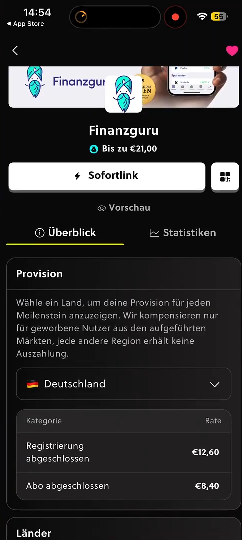 Die Provisionen sind oft höher als bei großen Plattformen. Dank spezieller Deals und geringer Marge. Wenn ihr schnell Provisionen wollt, testet Finanzguru und empfehlt es weiter.